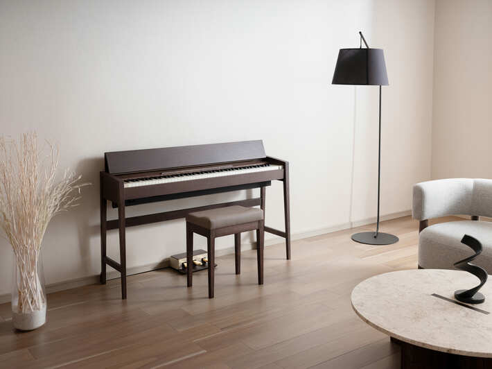 発売から10周年を迎える今年、島村楽器限定の「KF-25」が登場。直線基調の端正なデザインと、上質感漂う「スモークドオーク色」を採用したモデルです。ローランド最新のデジタルピアノ技術を搭載し、デザインの美しさと、ピアノとしての演奏性能の両立を実現しました。