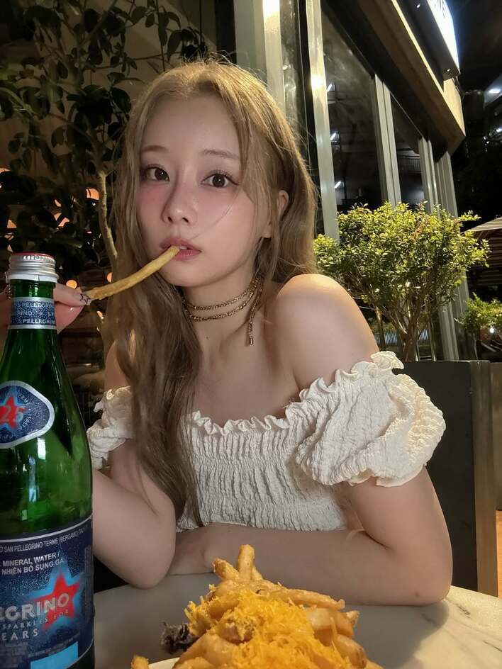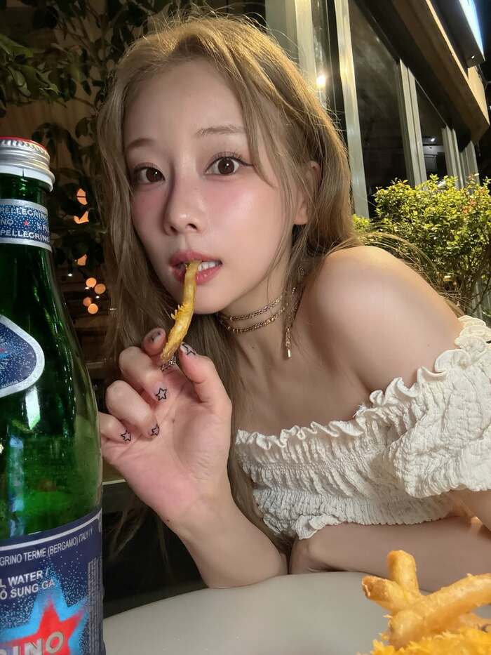 オフショル姿でポテトを味わう、夜のデート風写真が注目を浴びています。