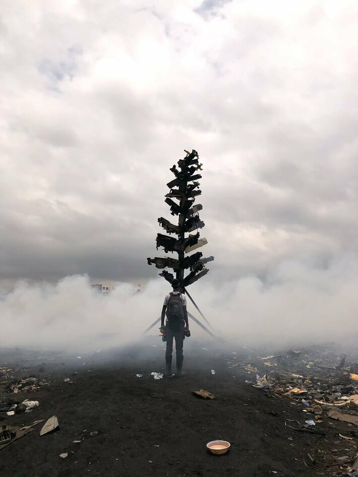 先進国から廃棄された電子機器が集まるスラム街・アグボグブロシーで、「汚染された大地の残留エネルギーを吸い上げて成長する樹木」をテーマに現地の人々と制作されました。