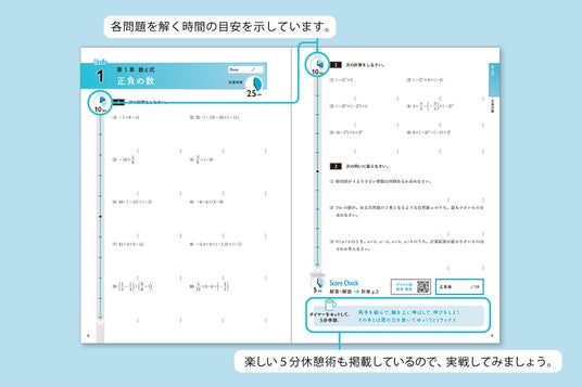 ▲各問題を解く時間の目安や楽しい5分休憩術も掲載しており、自然と効率的な学習サイクルが実現できます。