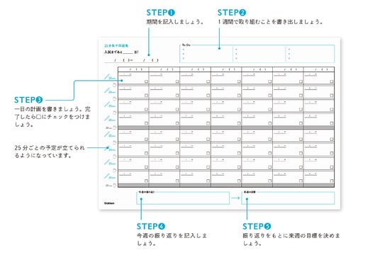 このシートでは、1週間分のやるべき勉強を書き出して、それらを25分ごとの予定として書き込めるようになっているので、「25分集中+5分休憩」の学習サイクルを自然と実現できます。