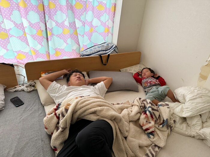 お笑いタレントで5児の父でもあるエハラマサヒロさんが2024年10月13日に自身のXを更新。自宅のベッドで息子と同じ寝相で寝るエハラさんの姿が投稿されました。