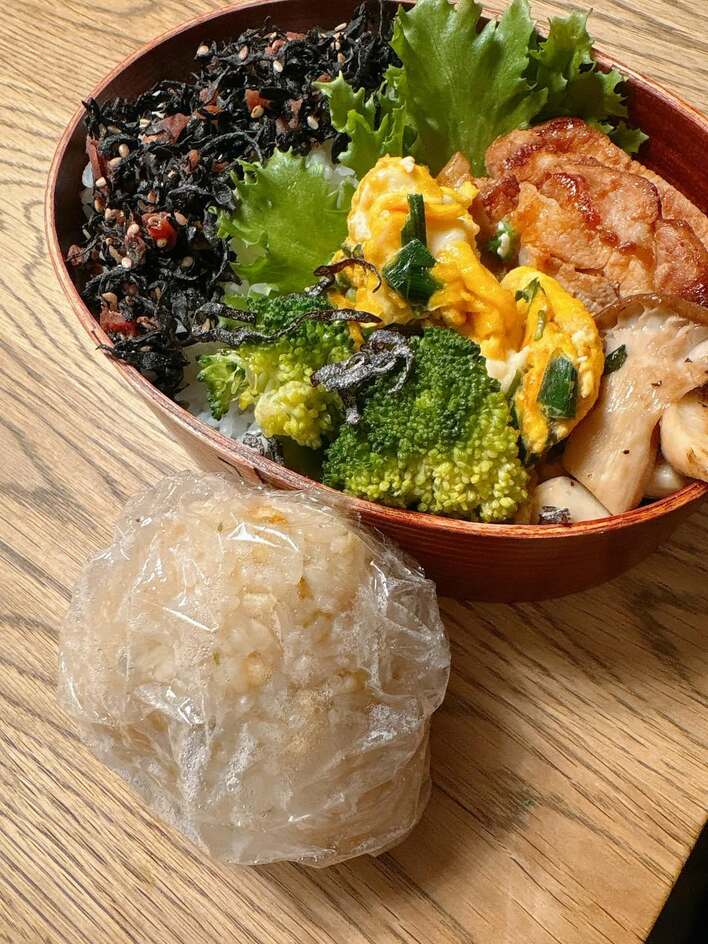 曲げわっぱのお弁当には、ブロッコリーやきのこ、スクランブルエッグやお肉が入っていて、ご飯の上には、ひじきのふりかけが、かかっていて見ているだけでお腹が空いてきます。