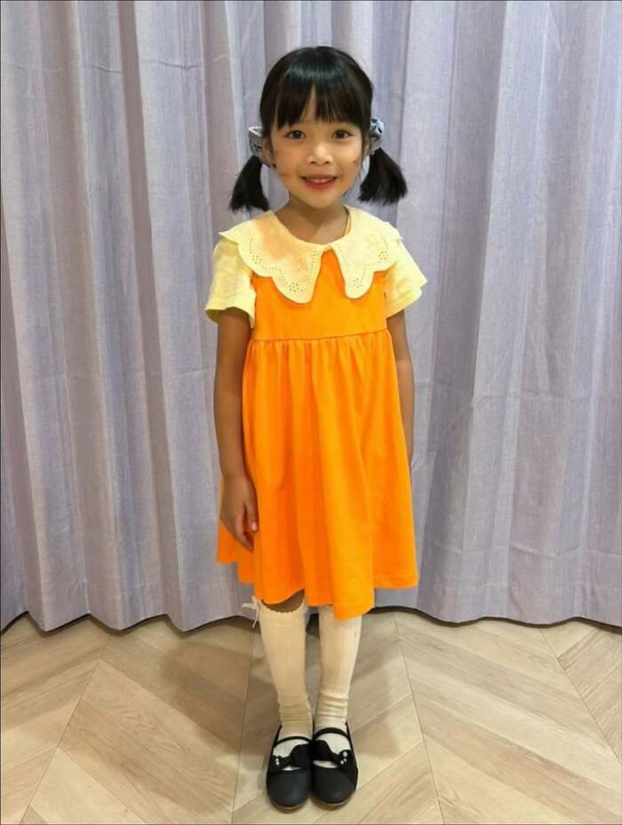 おさげヘアでほほ笑む瑛茉ちゃんは、黄色い半袖シャツにオレンジ色のワンピース、足元には黒色の靴を合わせ「ヨンヒ人形」を完璧に再現しています。