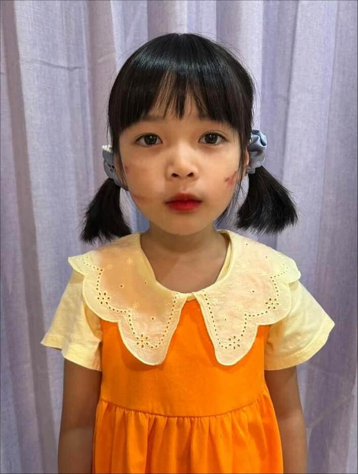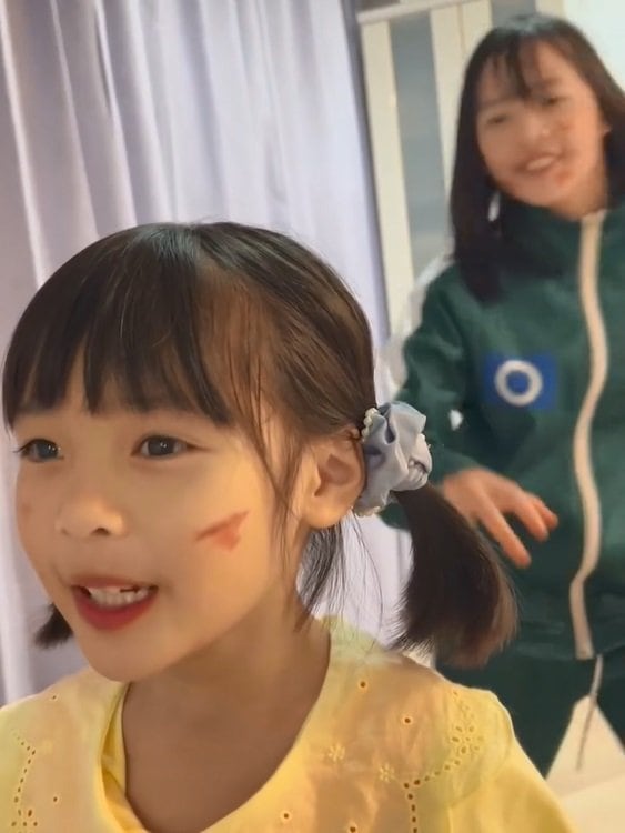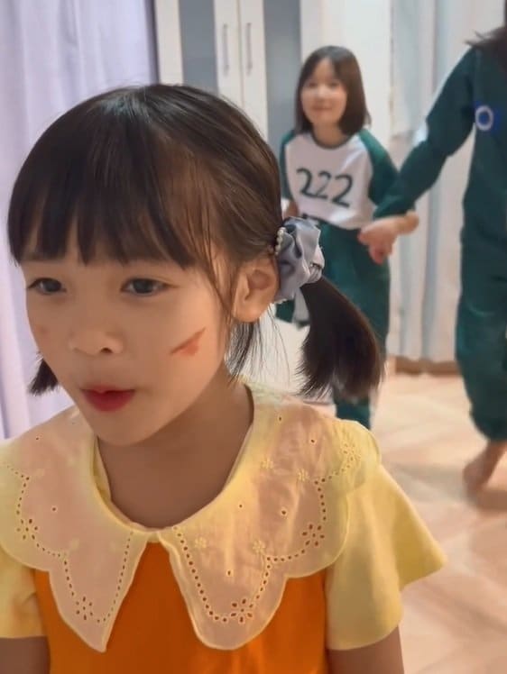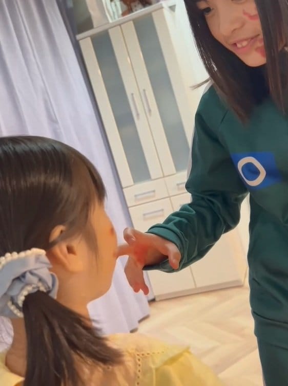 写真には、Netflixドラマ『イカゲーム』に登場するキャラクター「ヨンヒ人形」に大変身した瑛茉ちゃんの姿が。