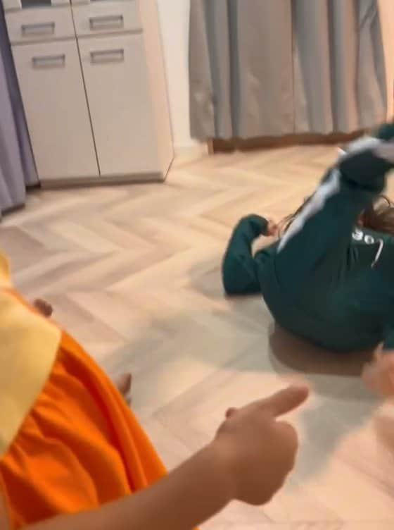 今回の投稿では、「いよいよ子供たちがお待ちかねのハロウィンがやってきますね 今年のえまちゃんはねぇね達とハマってる#イカゲーム の仮装です」と、『イカゲーム』のあの人形になりきった姿を披露。