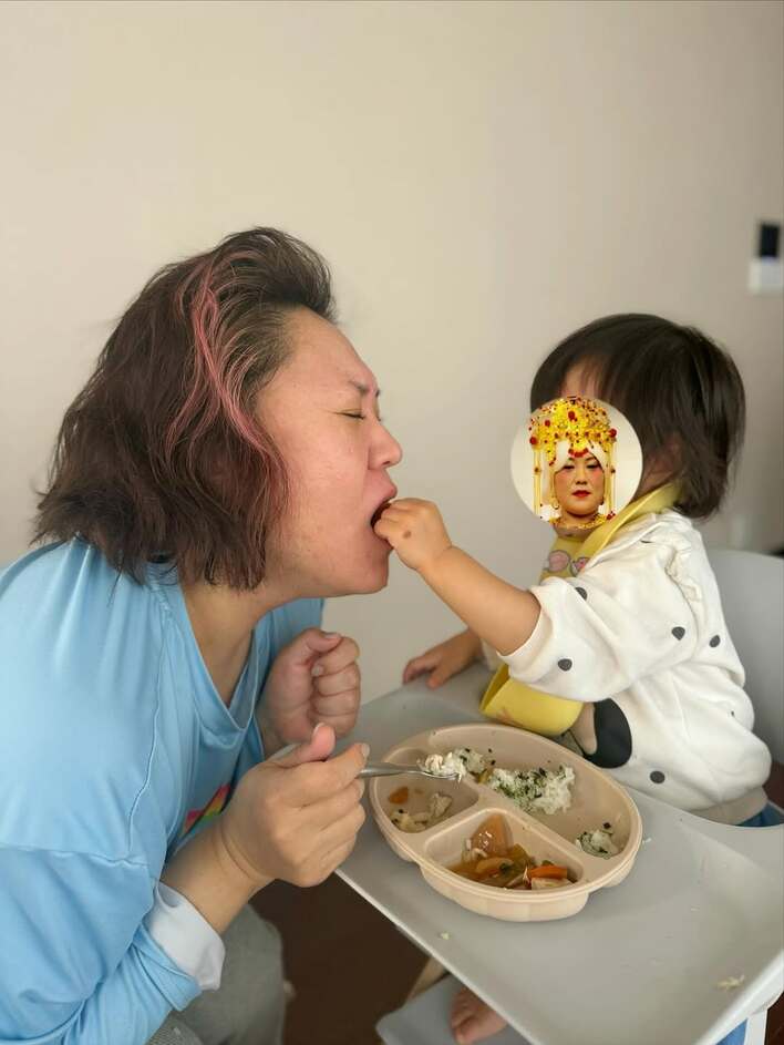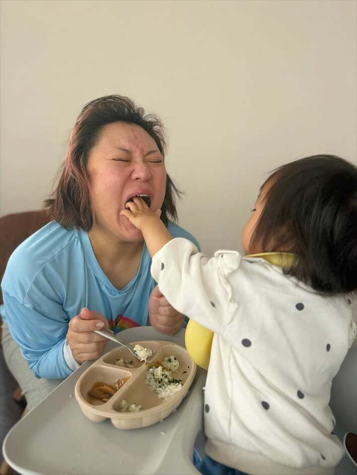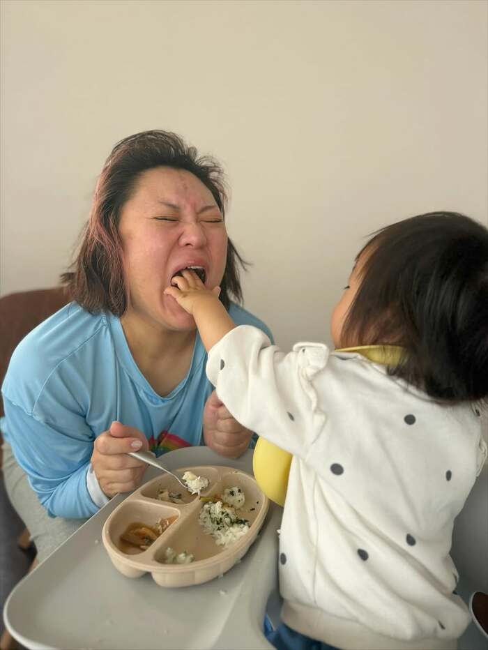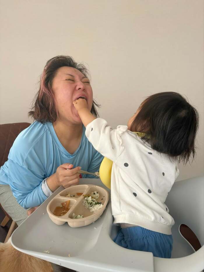 バービーさんは「最近の娘は私にご飯を与えることがブームのようです。」とつづり、写真を公開。自宅での娘の食事風景を写したショットのようですが、そこには本来ごはんを食べているはずの娘が、バービーさんの口元に手を運び、自身のごはんをあげていると思われる姿が!
