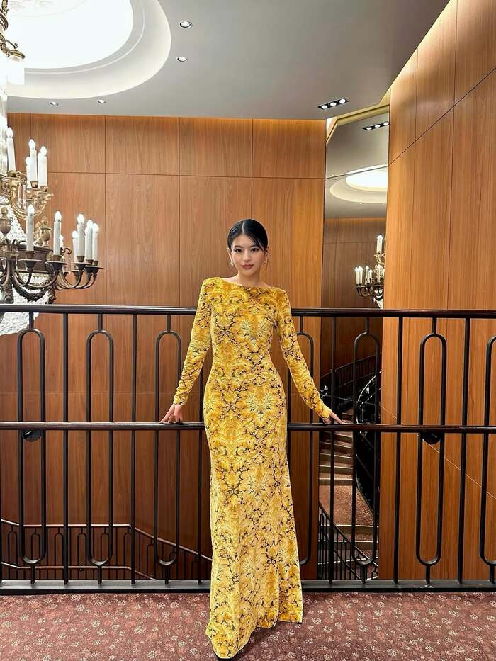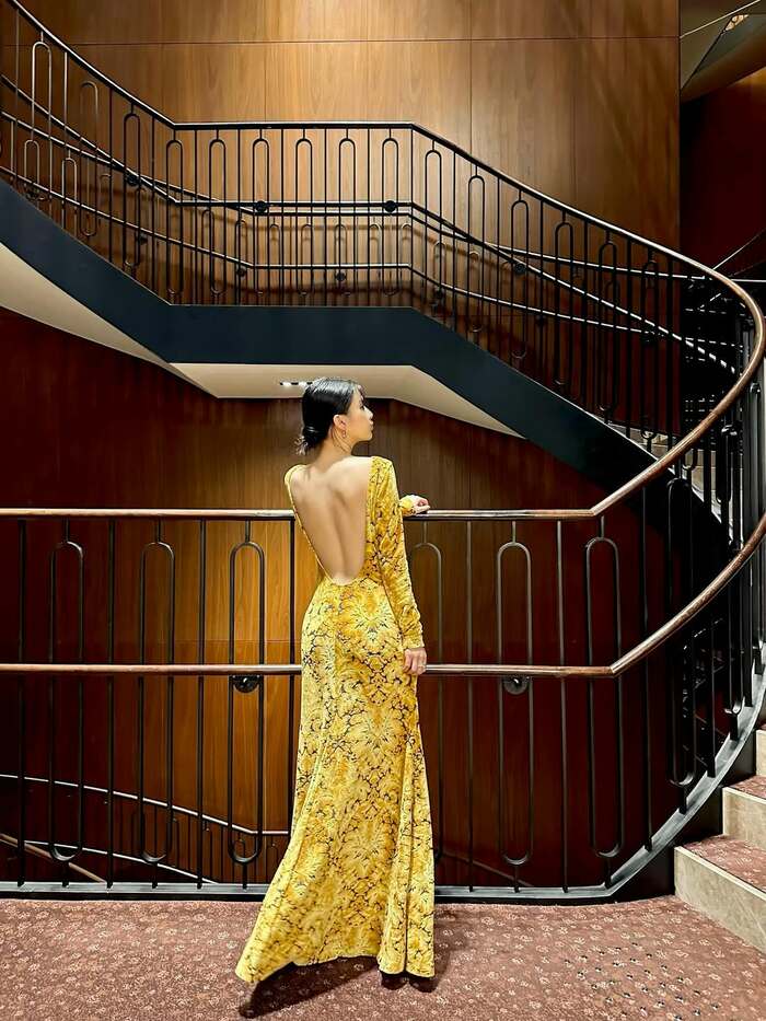 公開された写真を見てみると、バロック柄になった黄色のマキシ丈ワンピース姿で、カメラをじっと見つめる様子が!