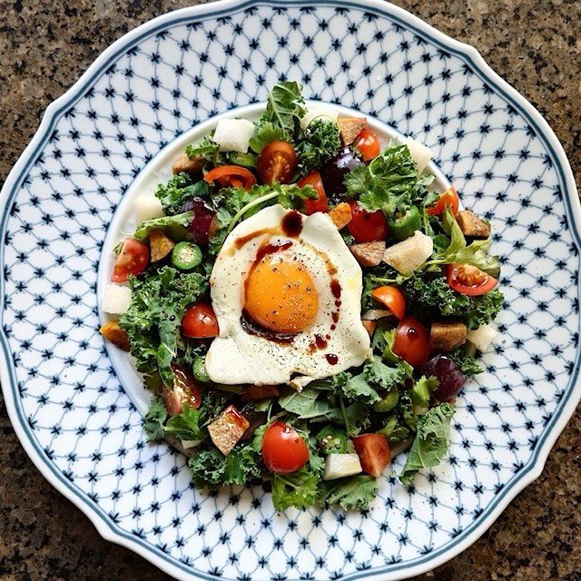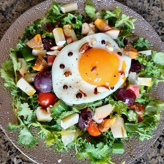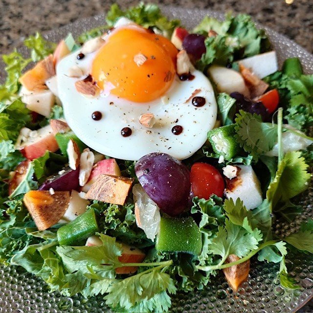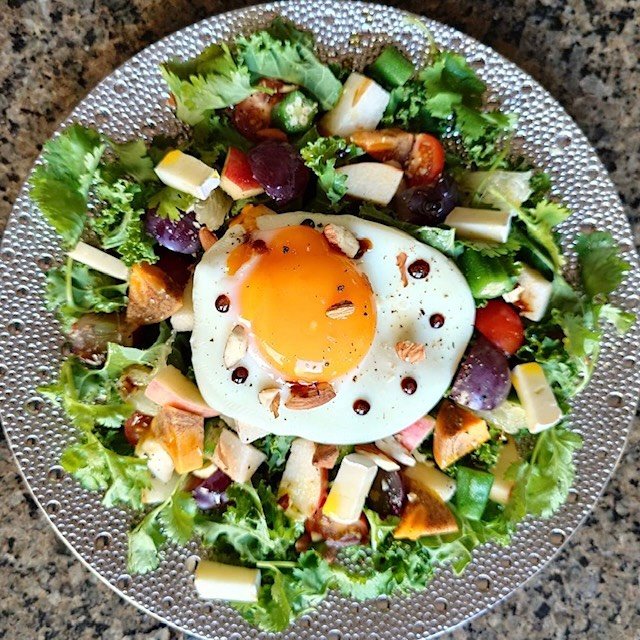 写真を見てみると、おしゃれな模様の丸い平皿に、ケール、パクチー、ミニトマト、オクラ、ぶどう、梨など、野菜や果物がたっぷりと盛り付けられていて、真ん中にはとろとろの半熟卵の目玉焼きがのっています。