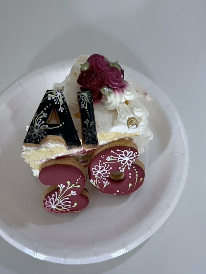 また、カットされたケーキに「AI」のチョコレートクッキーや花柄が描かれた「26」のクッキーが添えられています。華やかなケーキにテンションが上がりますね。