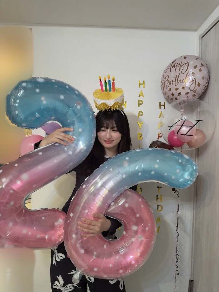 全身黒コーデで大きな「26」のバルーンを両手で抱える吉川さんの姿も披露しています。