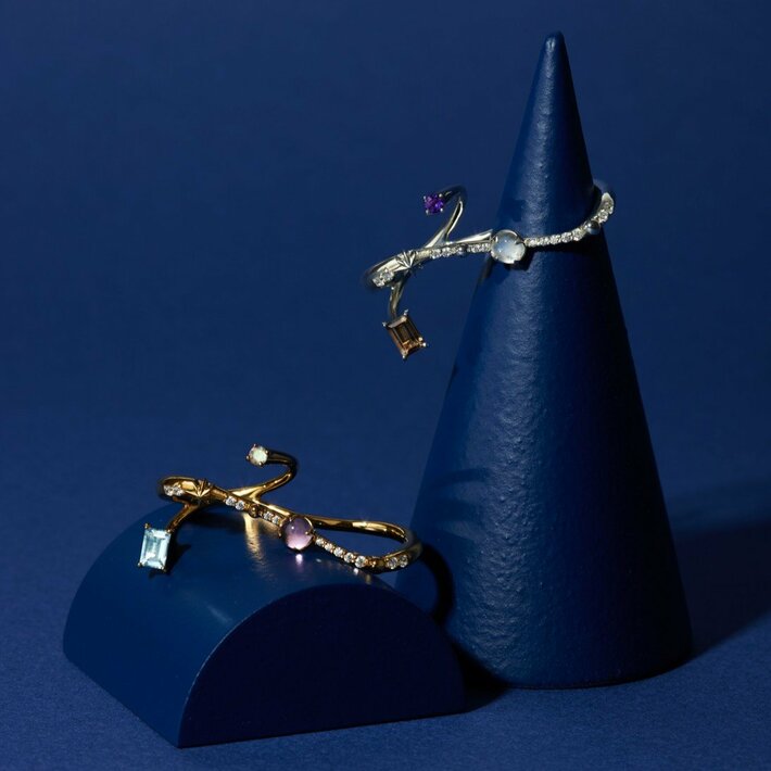 宇宙に煌めく星々を、彩りあふれる宝石で表現した「Cosmic GEM」。2025年ホリデー限定の新作は、宇宙船が互いに速度を合わせ同じ軌道上で接近するドラマティックな瞬間「Rendez vous(ランデヴー)」からインスパイアされた、ダブルフィンガーリング。