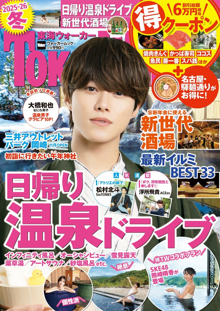 今回は、日帰りで名湯を巡る温泉ドライブを始め、忘新年会に使える新世代酒場や最新のイルミネーションなどを大特集。グルメやスーパー銭湯の割引クーポン企画など、お得に遊べる情報も満載です。翌2月まで使える保存版となっており、東海エリアを中心とした書店やコンビニ、ECサイトなどでお買い求めいただけます。本誌の主な内容は以下の通りです。