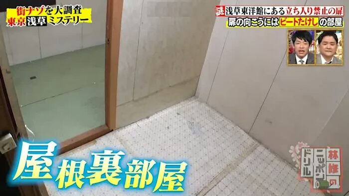 2畳の部屋がふたつあるだけの屋根裏部屋――。若き日のたけしが住んでいた場所に足を踏み入れ「ここにたけしさん住んでたんや…」と、ロッチの2人も感動の面持ち。この部屋は、現在老朽化のため立ち入り禁止となっているという。
