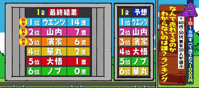 ウエンツさんは14票、2位から7票差で圧倒的1位となり、山内さんは「ウエンツくんが、ぶっちぎってるなぁ」とコメント。