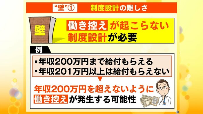 例えば、年収200万円までは給付をもらえるが、201万円以上はもらえないとなると、200万円以上の収入を得ないように“働き控え”が起こってしまう可能があります。