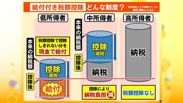 これは、低所得者は現金給付、中所得者は税額控除で納税負担が軽くなる、高所得者は税額控除が外れるという仕組みで、低・中所得者を対象にした現金給付と所得税の減税を一緒に行うことができ、家計支援の即効性に加え手取りがアップすることで持続性も兼ね備えていると言われています。