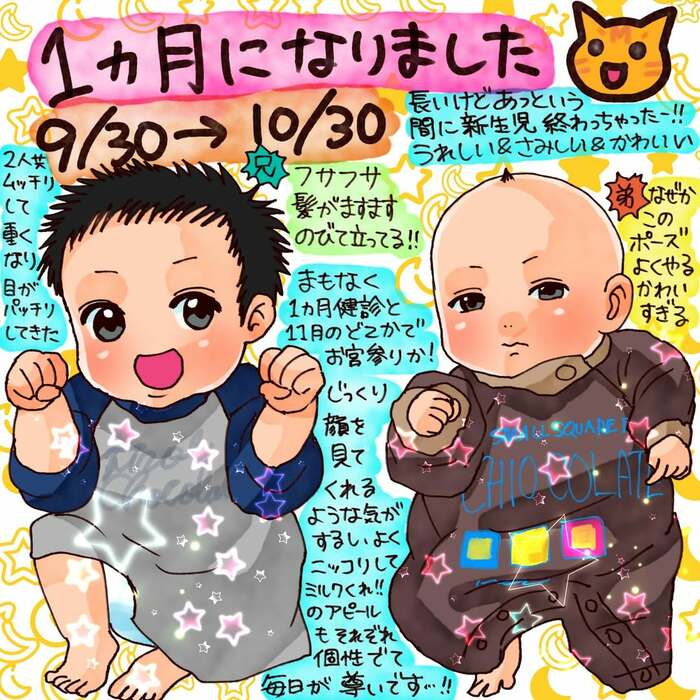 「1ヵ月になりました」と題した絵日記では、双子の成長を公開。
