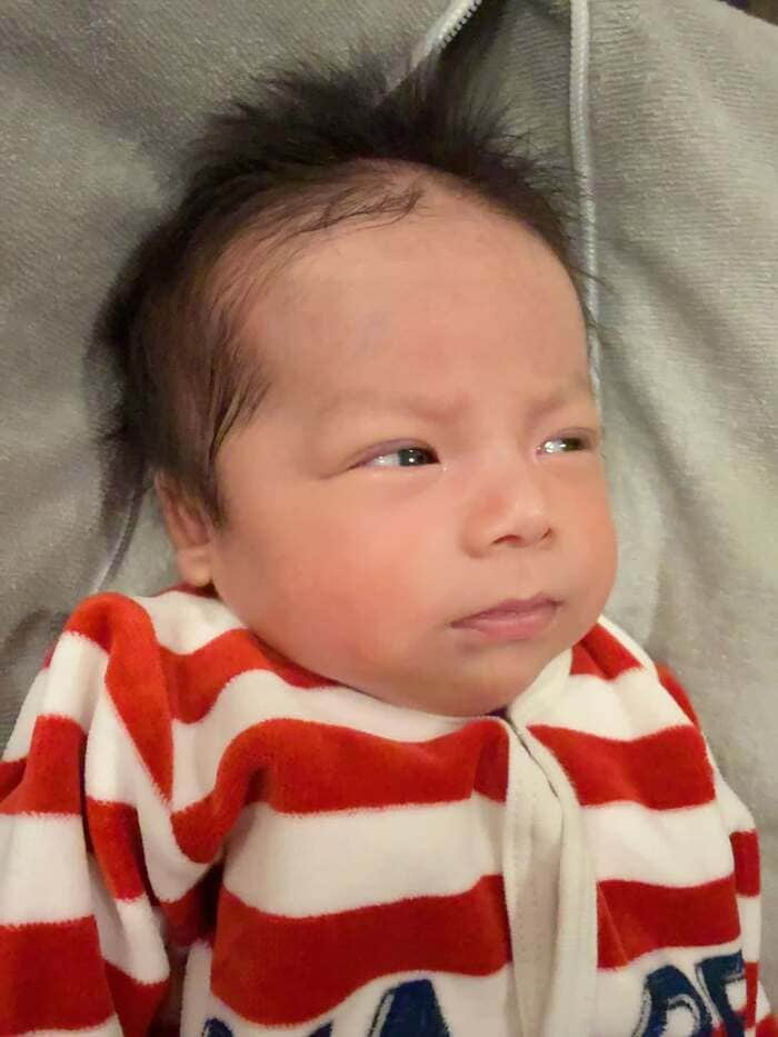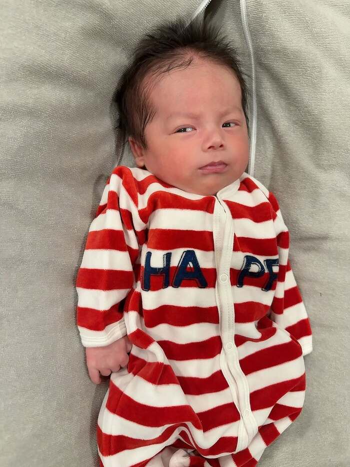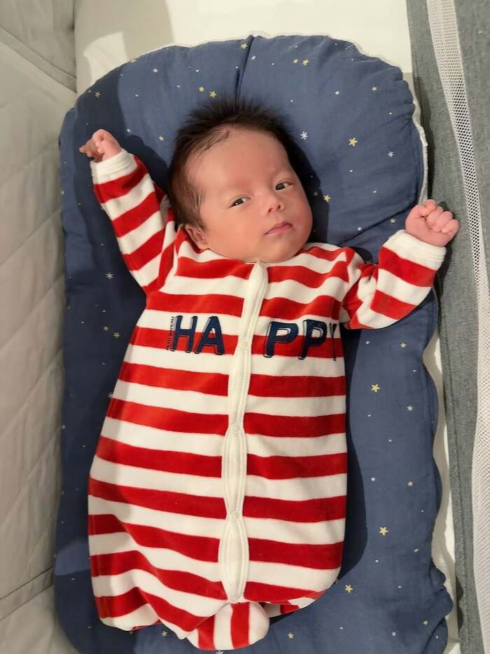 まずは、「HAPPY」と書かれた赤と白のボーダー柄のベビー服に身を包み、両手を思いっきり上に上げてバンザイしているような長男。