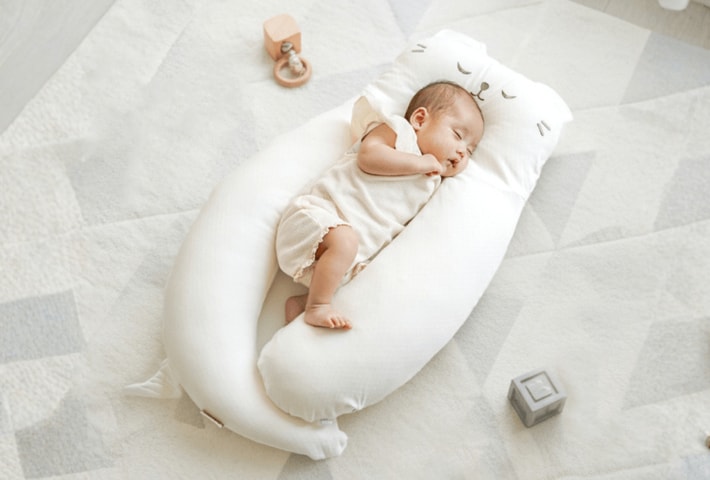 「bebenuvoハグピロー」は、赤ちゃんがお腹の中にいたときの“Cカーブ姿勢”を再現し、ママに抱かれているような安心感を与える抱き枕です。赤ちゃんの頭や体に自然にフィットする立体デザインで、絶壁頭や向き癖も予防します。