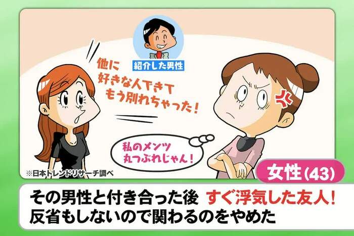 そんななか、「彼氏が欲しいという友だちに知り合いを紹介したのだが、すぐに別の男性と浮気をしたというので、関わるのをやめた」という43歳女性のエピソードが紹介されました。