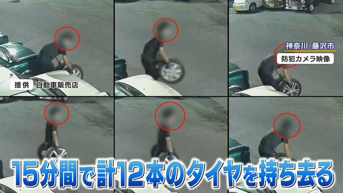 両手にタイヤを抱えてどこかへ消える行為を6回繰り返し、わずか15分の間に合計12本のタイヤを持ち去りました。