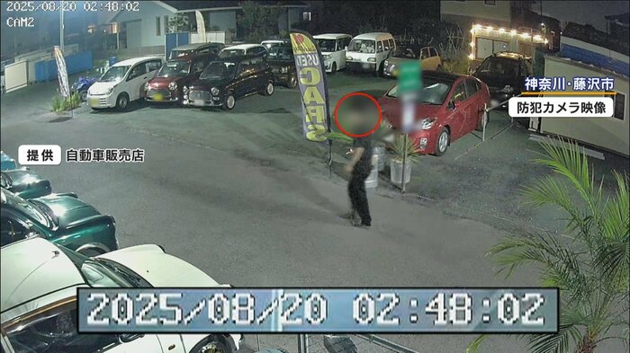 8月20日、神奈川・藤沢市内の自動車販売店で撮影された防犯カメラ映像には、暗闇の中、敷地内に侵入する、マスクをつけた黒の半袖・長ズボンの人物の姿が映っていました。