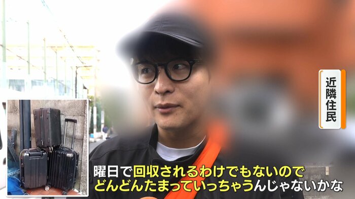 民泊みたいなアパート一棟そういうところから観光客がワッと出てくることがあるので。この辺(スーツケースが)安く売ってるので、大きいのに買い替えたりするでしょ。そうするとああいうふうに置いていっちゃうんじゃないかなと私は思う。