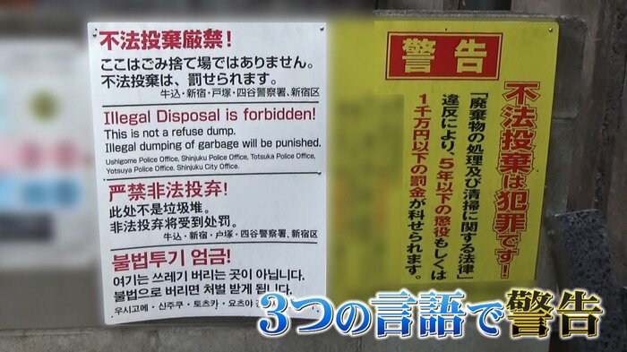 ゴミ捨て場のすぐ横には、日本語の他にも3つの言語で「不法投棄禁止」について警告しています。それでも…。
