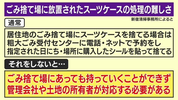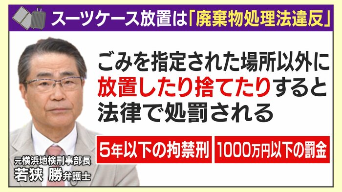 元横浜地検刑事部長の若狭勝弁護士によると、スーツケースを指定された場所以外に放置したり捨てたりすると、「廃棄物処理法違反」にあたり、5年以下の拘禁刑または1000万円以下の罰金、もしくはその両方が科せられる可能性があるということです。