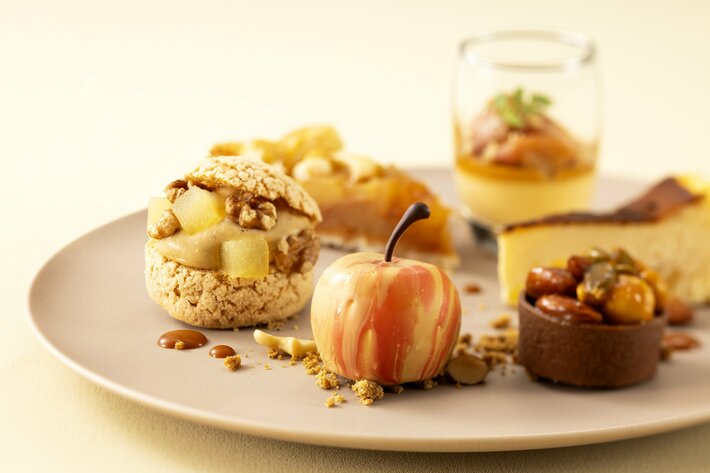 りんごとナッツが彩る、秋の華やかなスイーツの饗宴 URL : https://grand1934.com/offer/restaurant/new_sweets_bread/