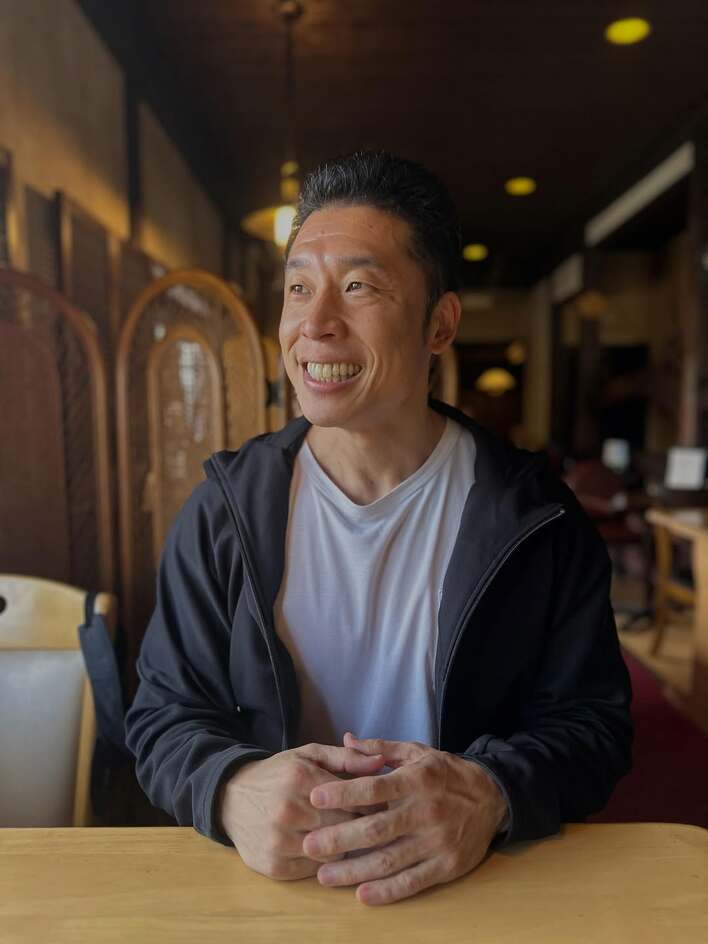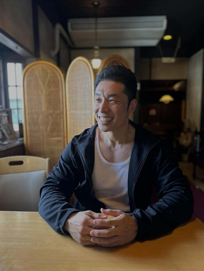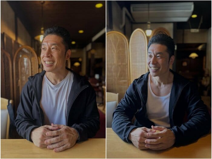 そして、公開された1枚目の写真を見てみると、白のインナーに黒のパーカーを着たきんに君が、あたたかみのある雰囲気のカフェの一席に腰掛け、手をテーブルの上で組みながらさわやかな笑顔で外を見ているようなショットが。