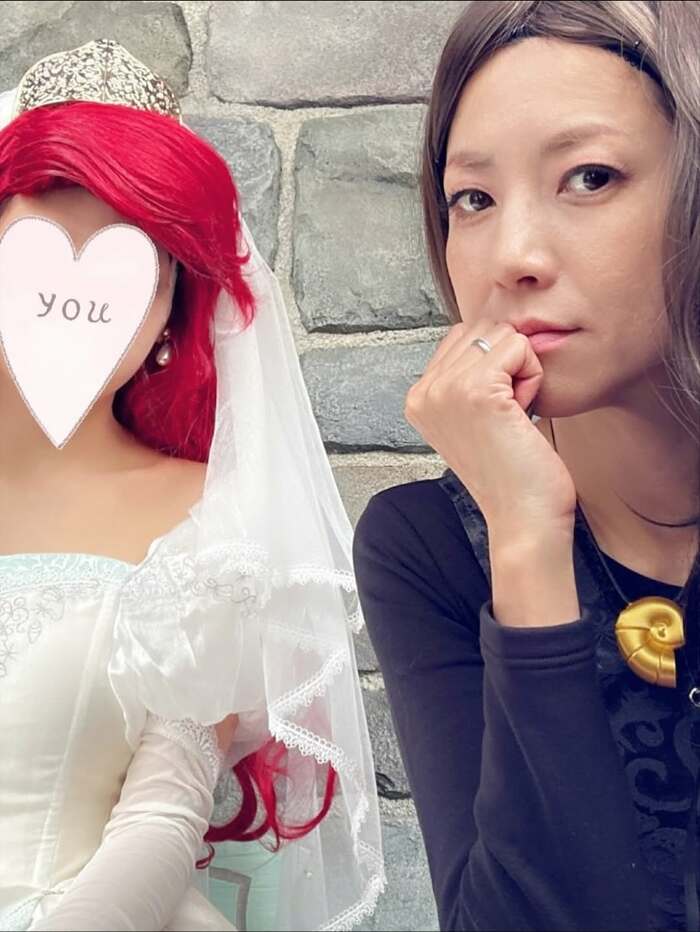 「娘とディズニーハロウィン行ってきました。」と、娘と一緒に東京ディズニーシーのハロウィンイベントへ行ったことを報告し、「リトル・マーメイド」に登場する「ヴァネッサ」に扮した仮装姿を披露しました。