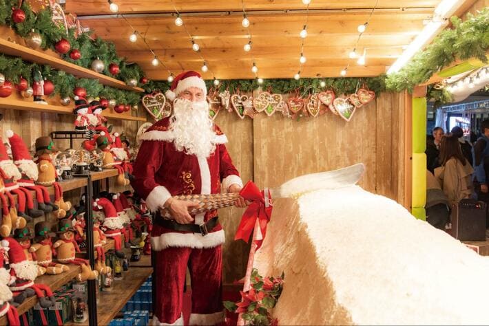 エルツ人形やサンタが出迎えるあたたかな雰囲気の中で、本場さながらのマーケット体験を楽しめます。