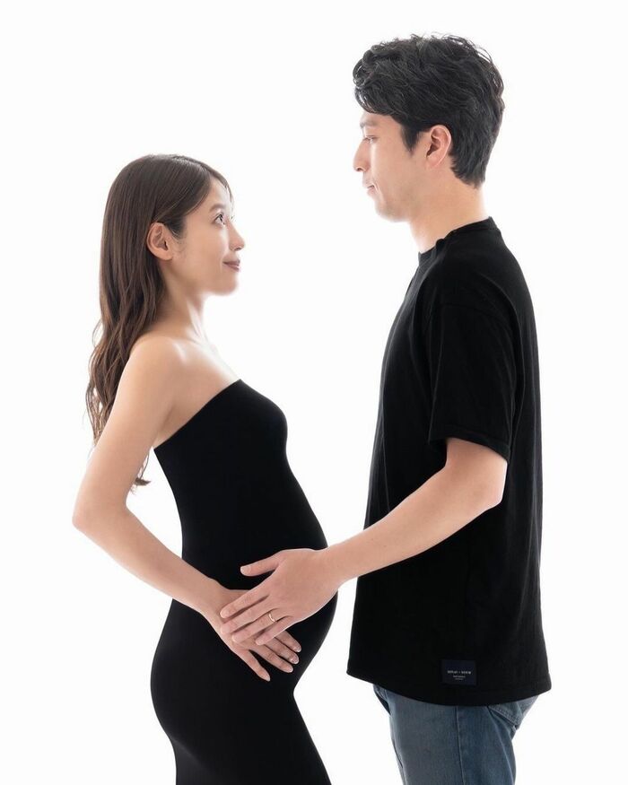 公開された写真には、真っ黒の服を着た岡副さんが、大きくなったお腹の上に手を乗せ優しく微笑む姿や…