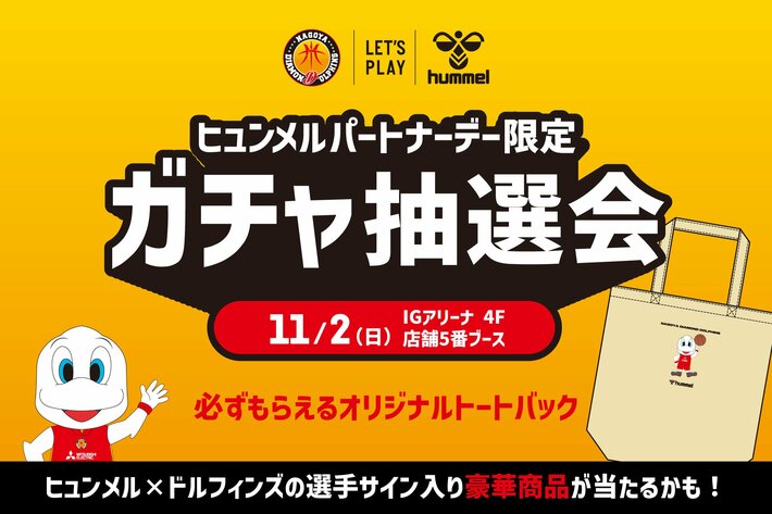試合当日の11月2日、12時から15時まで、IGアリーナ内のサブアリーナにヒュンメルブースを設置。ヒュンメルパートナーデー限定のオリジナルトートバックが必ず当たるガチャ抽選会を実施します。抽選会は1回1,000円で特等から4等まで。758番の選手サイン入りユニフォームを目玉に、ヒュンメル商品やクーポン券などが入ったトートバックが当たります。
