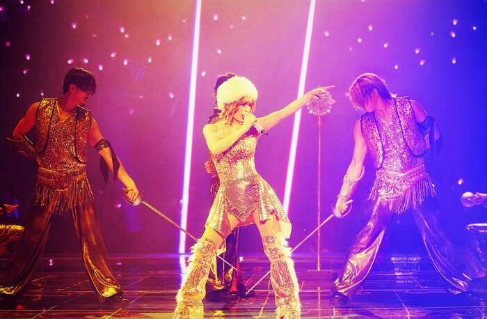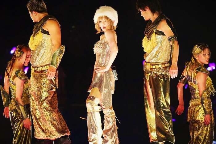 浜崎さんは、アラビアンな雰囲気香るゴールドのミニ丈衣装に身を包み、遠くを指さす振り付けをしながら熱唱しています。