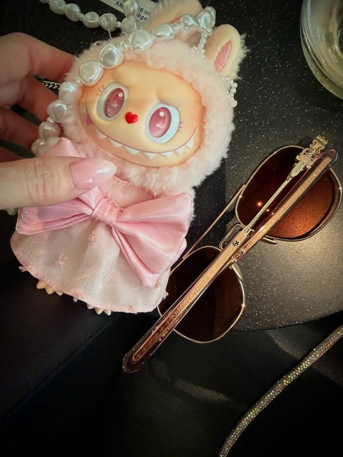 大きな赤いレンズのサングラスをかけ、顔の横にラブブを掲げて見せていて、口をすぼめた表情でポージングしています。