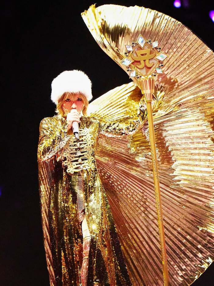 全身ゴールドのきらびやかな豪華衣装を着こなし、まっすぐ前を見つめて真剣な表情で歌っている姿も!