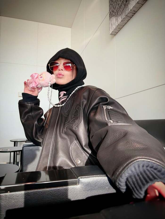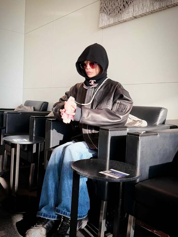 浜崎さんは、黒いシックなソファがずらりと並んだラウンジのような部屋を、ブルゾンにデニムパンツ、頭にはバラクラバをかぶったラフな格好で歩いていて、肩掛けされたピンクの「LABUBU(ラブブ)」がコーデのアクセントに!