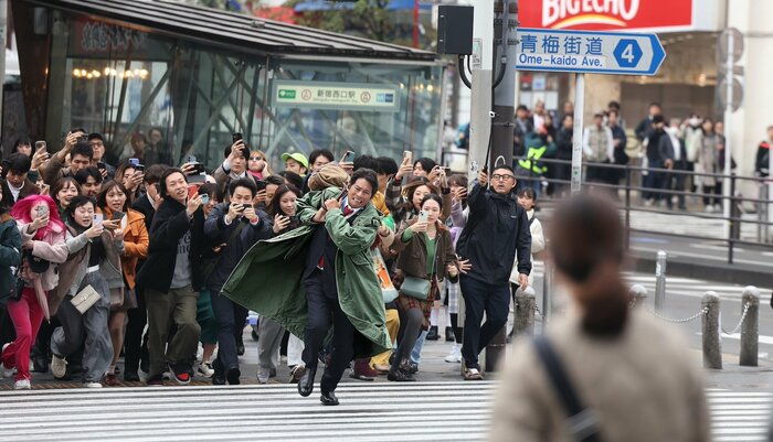 初日は雨が降りしきる中、新宿のど真ん中で早朝から撮影スタート。約400人のエキストラが待機する中、雨が止まず、一時は撮影中止の暗雲が立ち込めましたが、主演の織田さんが、トレードマークの“青島コート”を着て登場した瞬間に雨が止むという奇跡が。
