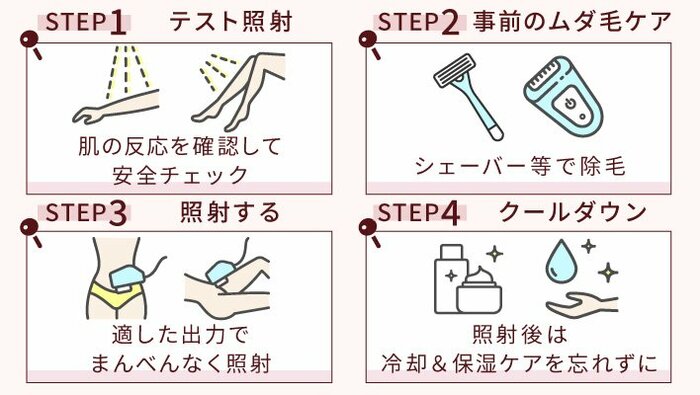 VIOに脱毛器を使う際の、基本的な手順を紹介します。ただし以下はあくまで一般的な手順なので、実際に使うときには必ず商品の取扱説明書を参照してください。