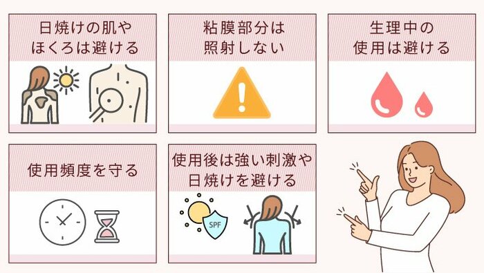 早く効果を感じたいからといって、頻繁に使いすぎるのもNGです。肌トラブルの原因になるため、商品の取扱説明書に記載されている頻度を守りましょう。