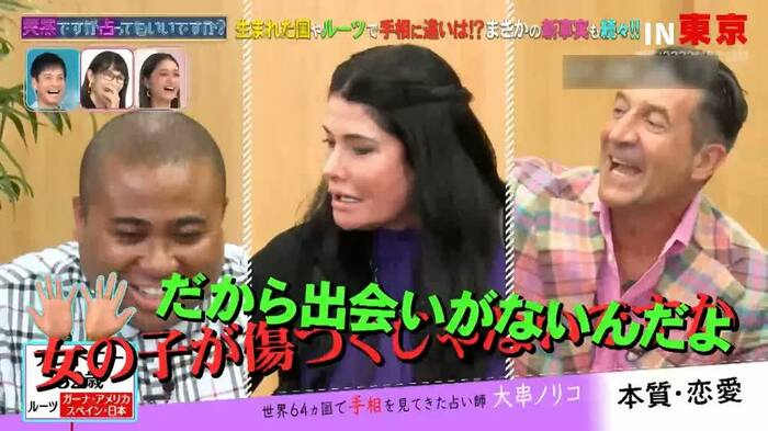 イタリア人のジローラモさんですが、大串さんは手相を見ると「一般的な日本人タイプ」とズバリ。「“ちょい悪”とか言ってるけど、むしろ優しい人」と続けると、ジローラモさんは“キャラ崩壊”を恐れるも「違う…キャラを作ってもらった…」と、しどろもどろに。