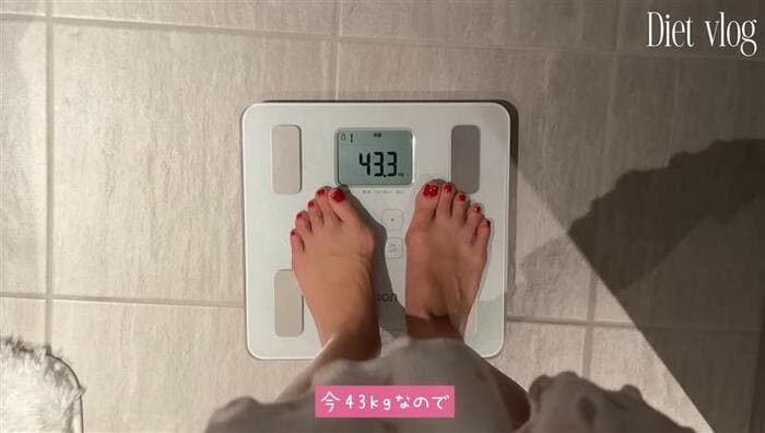 体重計に乗って確認すると、「今43kgなので39kgにいきたいです」と産後前ぐらいの値に戻したいそうです。