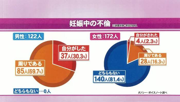 まずは「妻の妊娠中に不倫をしたことがあるか?」という、緊急アンケートの結果が発表された。すると男性は「自分がした」が30.3%で、「周囲の人がしていた」という回答と合わせると100%という結果に。