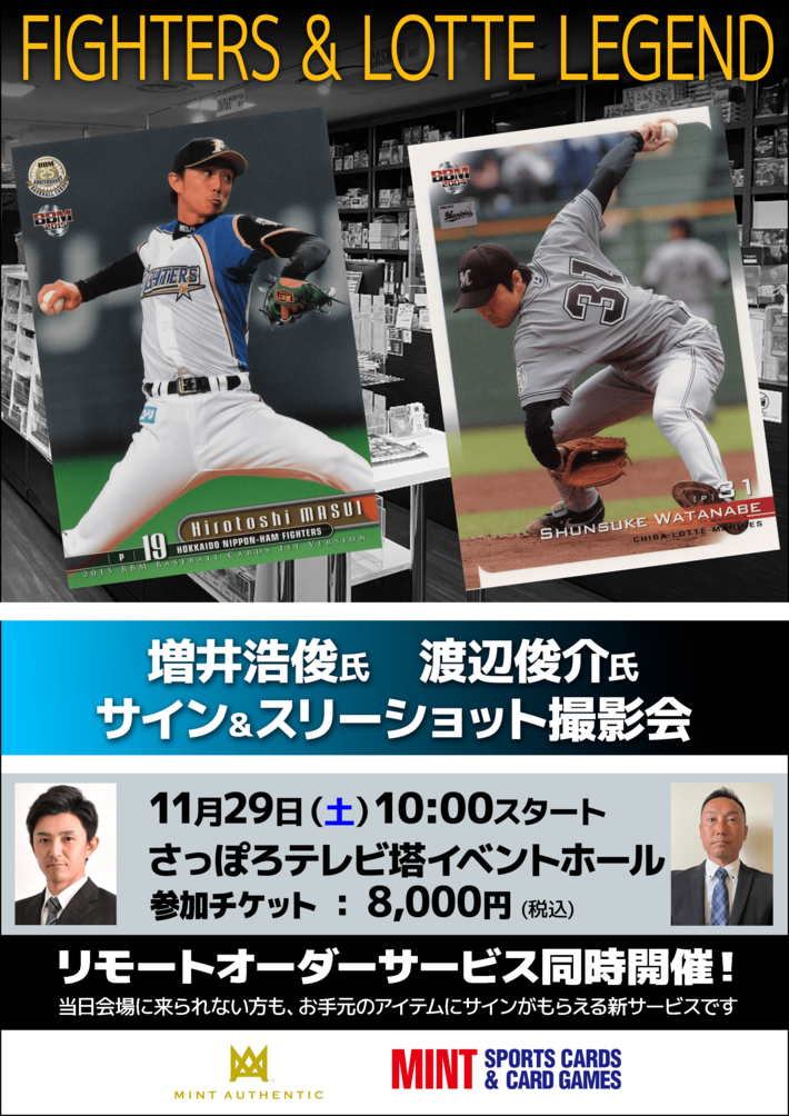 北海道日本ハムファイターズなどで活躍した増井浩俊氏と、千葉ロッテマリーンズで活躍した渡辺俊介氏が、2025年11月29日(土)に北海道・札幌にてサイン&スリーショット撮影会を開催いたします。