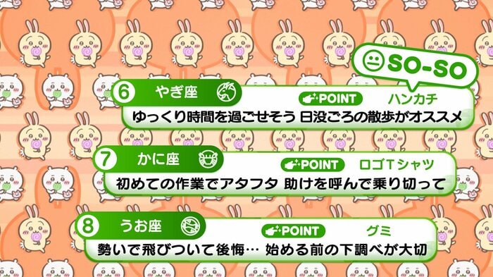 『めざましテレビ』で放送中の「ちいかわ占い」 テレビ放送がない日はお休みで、月~土:朝7時以降に更新予定です。