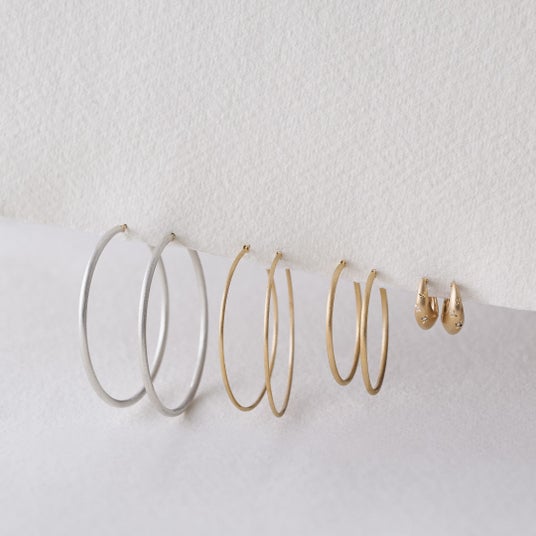 シルキーな質感のフープピアスは、主張しすぎず大人の抜け感を演出できる。
