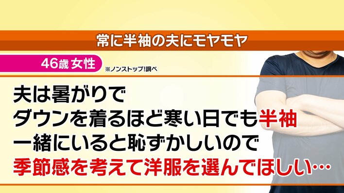 まず紹介されたのは、「夫が暑がり。自分がダウンを着る陽気でも半袖を着ていて、一緒にいると恥ずかしい」という、46歳女性のお悩みです。